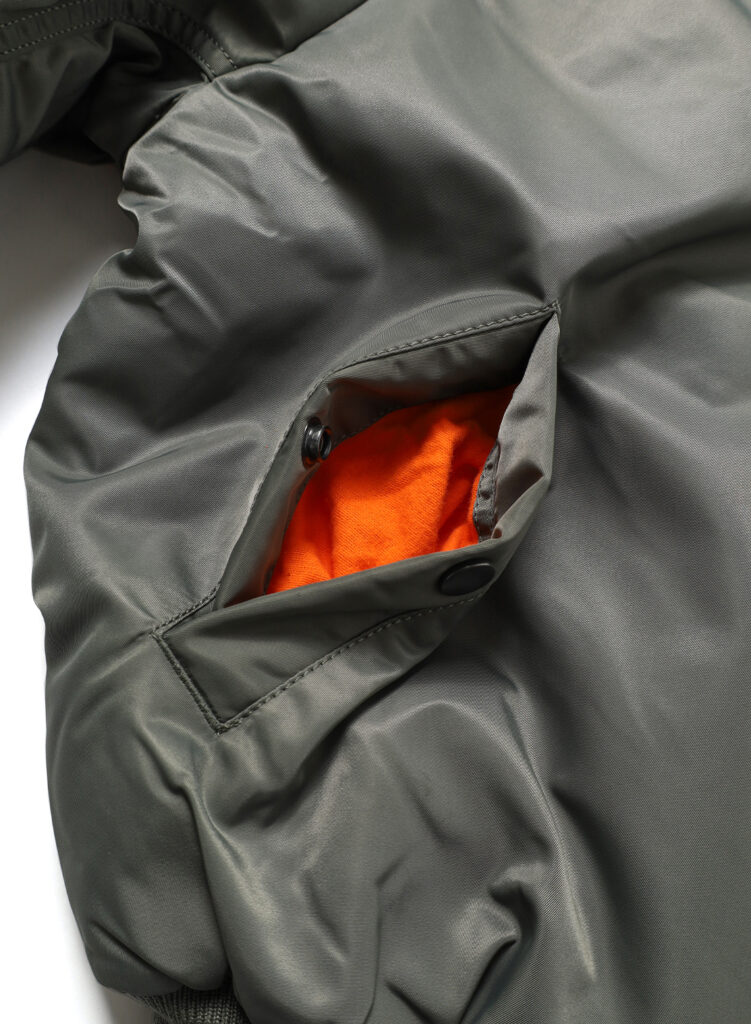 さらに見えない部分ではありますが、ポケットスレーキには、のちにMA-1の裏地として採用されるレスキューオレンジを用い、さりげない遊び心を添えました。