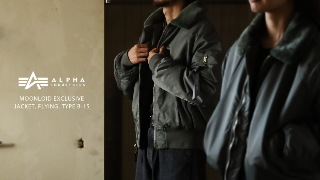 2025年10月15日(水)20時よりALPHA INDUSTRIES協力のもと完成したB-15 FLIGHT JACKET – MOONLOID EXCLUSIVE – が発売となります。