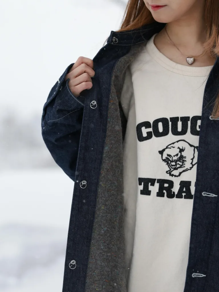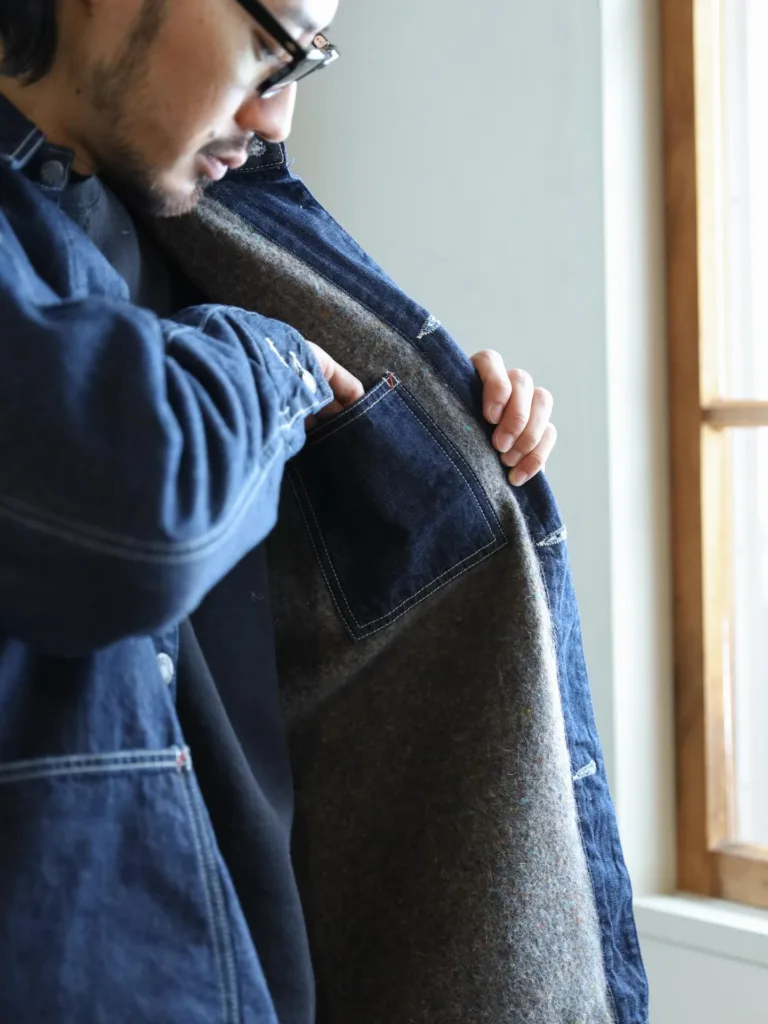 資材統制下で簡素化された当時のワークウェアに、「もしも冬用が密かに作られていたら」という想像を重ね、ブランケット裏地とチェンジボタンを組み合わせています。
