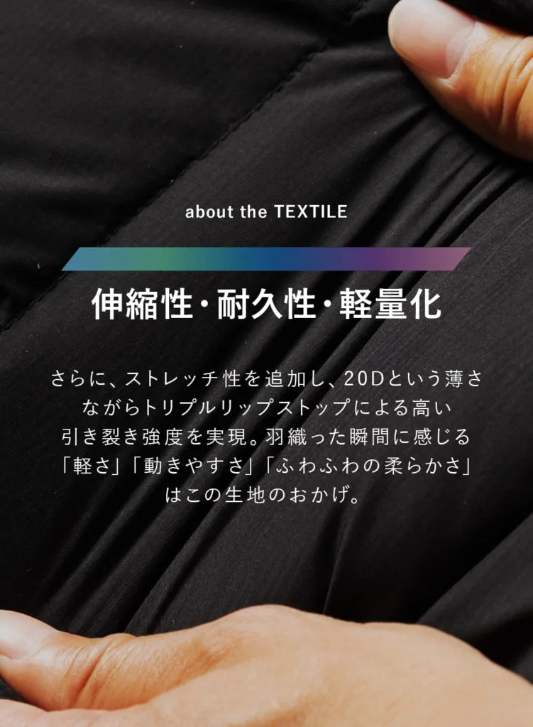 表地のナイロン素材は、軽量性を重視しながらも、リップストップ構造による引き裂き強度を確保しています。さらにストレッチ性を持たせることで、着用時の動きやすさや、ダウン特有の突っ張り感を抑えています。袖を通した瞬間に感じる軽さや、体の動きに自然に追従する感覚は、この生地設計によるものです。