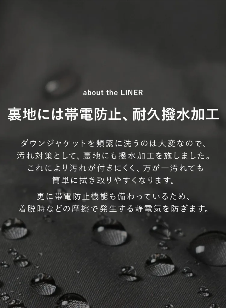 裏地には、帯電防止機能と耐久撥水加工を施した素材を使用しています。冬場に起こりやすい静電気を抑えることで、着脱時の不快感を軽減すると同時に、インナーへのまとわりつきを防ぎます。また、汚れが付着しにくく、付いた場合でも拭き取りやすい仕様は、日常着としての扱いやすさを高めています。
